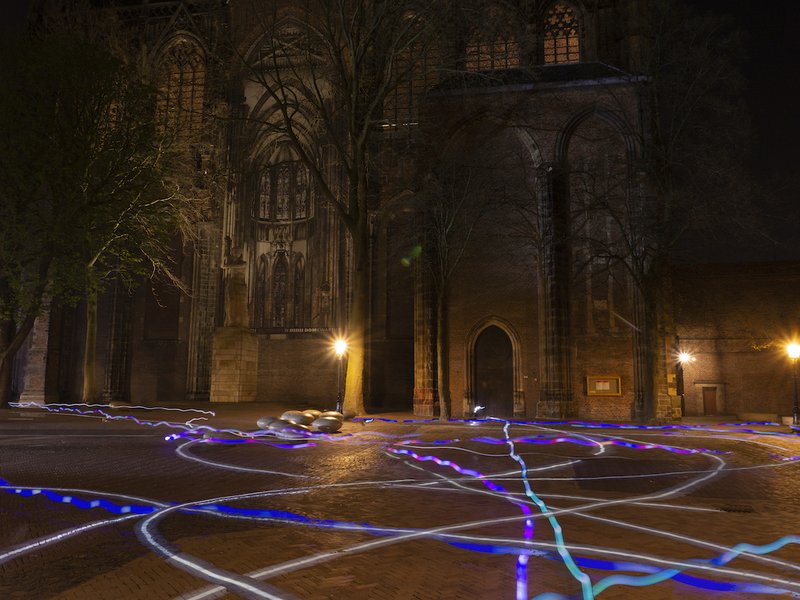 Kunst bestaat niet in een vacuüm, en onze projecten al helemaal niet. De lichtkunst van Studio SPÉS staat middenin de openbare ruimte en komt pas tot leven door de interactie met die ruimte. Momenteel werken wij aan de realisatie van ons nieuwste project, Desire Lanes, dat is geïnspireerd door olifantenpaadjes. De eerste expositie zal plaatsvinden op het Domplein te Utrecht in het kader van Utrecht900 en wordt in samenwerking met Pegamento en Light-Up Collective gerealiseerd. Desire Lanes komt het beste tot zijn recht in een bijzonder stedenbouwkundig fenomeen: de ‘shared space’. Rijstroken worden samengevoegd met voetgangersgebieden en het is aan de weggebruiker zelf om de meest logische route te kiezen. Graag maken wij voorbijgangers bewust van de keuzes die zij daarbij maken, laten we zien wie datzelfde pad genomen heeft, en tonen we een vorm van sociale interactie die in deze sterk geïndividualiseerde wereld dreigt te verdwijnen. Juist in een tijd waarin we interacteren, communiceren en navigeren via een scherm, willen we mensen om zich heen laten kijken. Gedurende de expositieperiode registreren we middels Artificial Intelligence (AI) de routes die voorbijgangers rondom de installatie afleggen, deze data worden vervolgens door een algoritme omgezet in sporen. Wanneer de schemering is ingevallen, komt de installatie tot leven, en worden de sporen in zachte, vriendelijke kleuren geprojecteerd op het plein. Naast de live projectie maken we de verkregen data inzichtelijk op interactieve schermen.